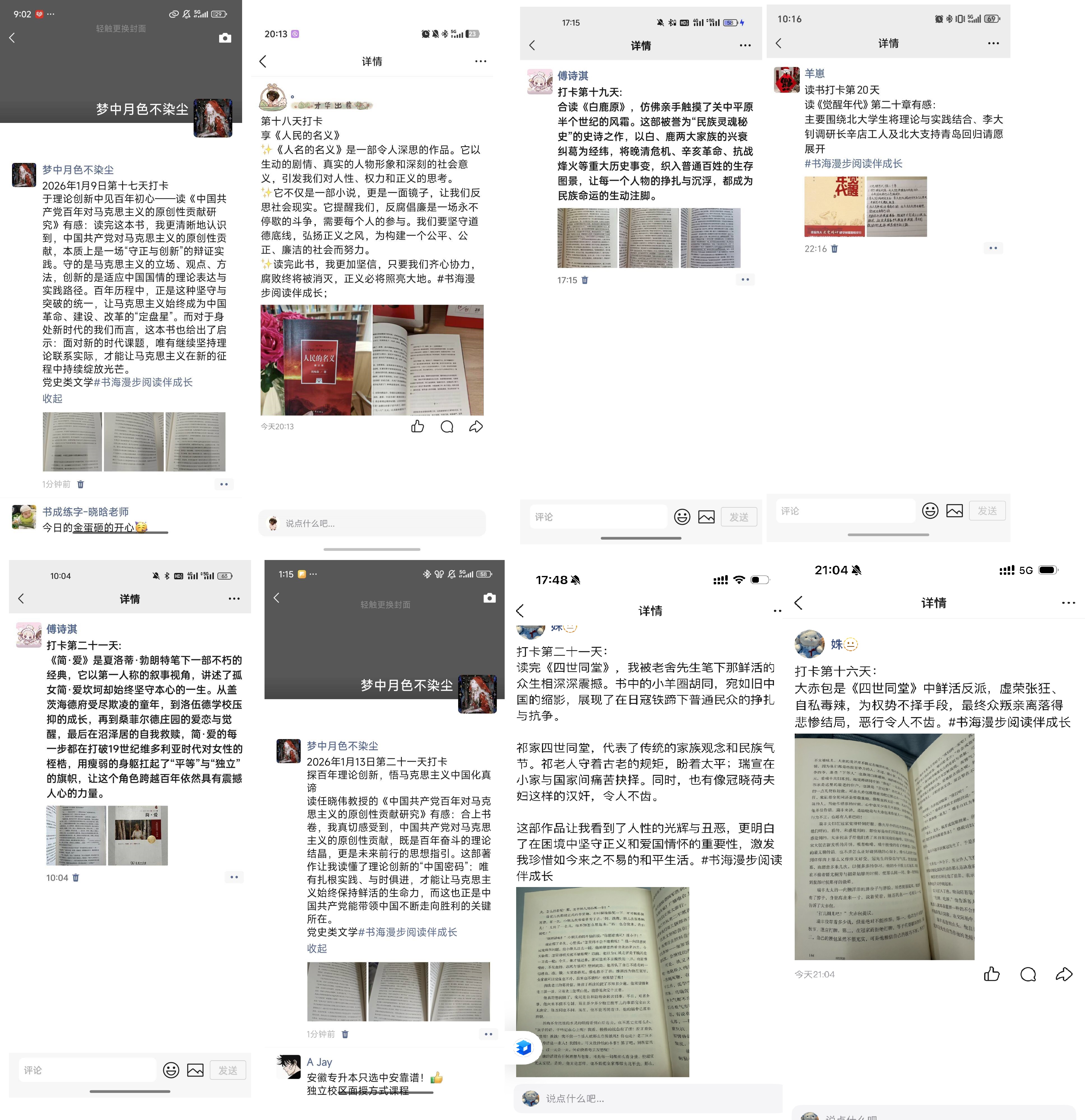 活动期间,同学们踊跃参与,通过线上平台分享每日阅读的打卡照片与心得感悟,形成了浓厚的读书氛围。同学们在打卡过程中,不仅记录了阅读的点滴,还互相交流读书心得,分享阅读乐趣,展现出对知识的渴望与对阅读的热情。