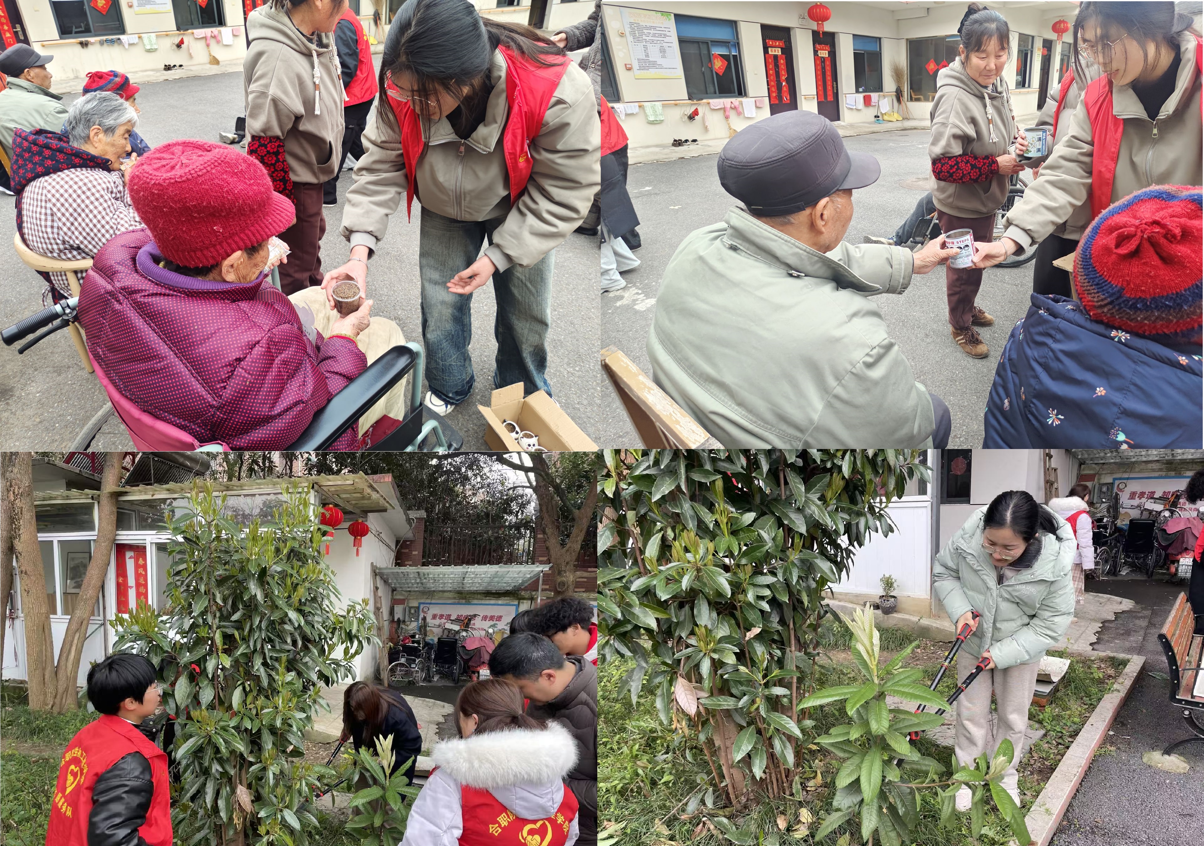 来到养老院后,一些志愿者为老人送上精心准备的绿植盆栽,这些绿植盆栽由四季心晴社组织学生们提前种植,并附上学生们书写的爱心卡片。“春日送绿”以绿意寄深情,祝愿长辈们福寿安康、四季常青、平安顺遂。长者们接过绿植,脸上洋溢着温暖的笑容。李奶奶笑着说:“这豆瓣绿真好看,摆在房间里既养眼又清新,谢谢你们想着我们!”其他的志愿者则在生物工程学院第三党支部赵弼皇老师、闫小满老师和张菲老师的指导下开展园区园林植物养护工作,大家分工协作,剪刀挥舞、水桶穿梭。志愿者们凭专业经验把控树苗修剪细节,大家主动扛起重活,搬运、扶苗、施肥、浇水一气呵成。“亲手为老人们营造良好环境,特别有成就感!”学生志愿者吴亚宁擦着汗珠,笑容格外灿烂地说道。