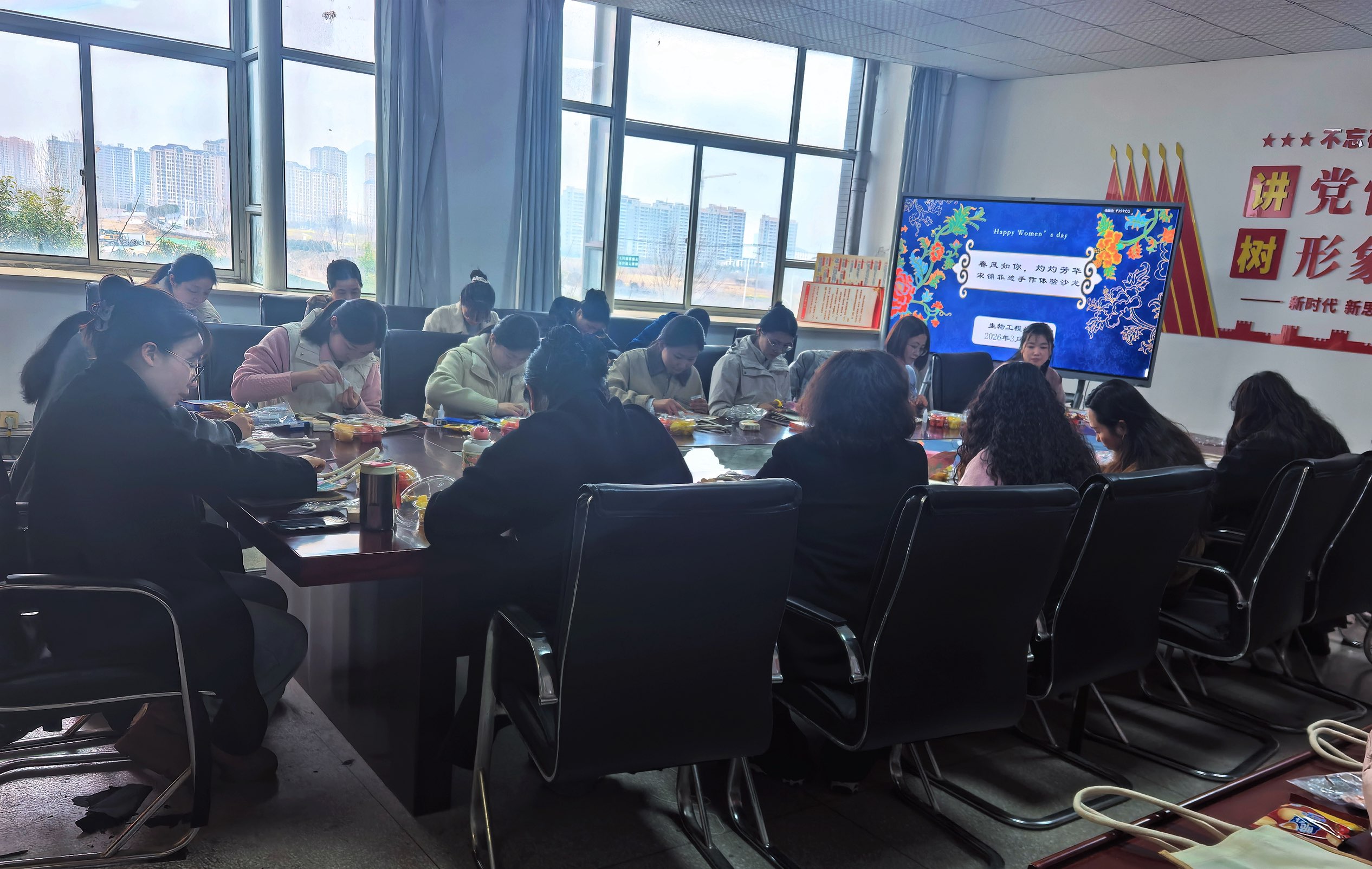 为庆祝 2026 年 “三八” 国际妇女节,丰富女教职工精神文化生活,3 月 11 日下午,合肥职业技术学院生物工程学院在生化楼 A311 成功举办 “春风如你 灼灼芳华” 宋锦非遗手作体验沙龙,学院27名女职工欢聚一堂,沉浸式感受非遗文化之美。